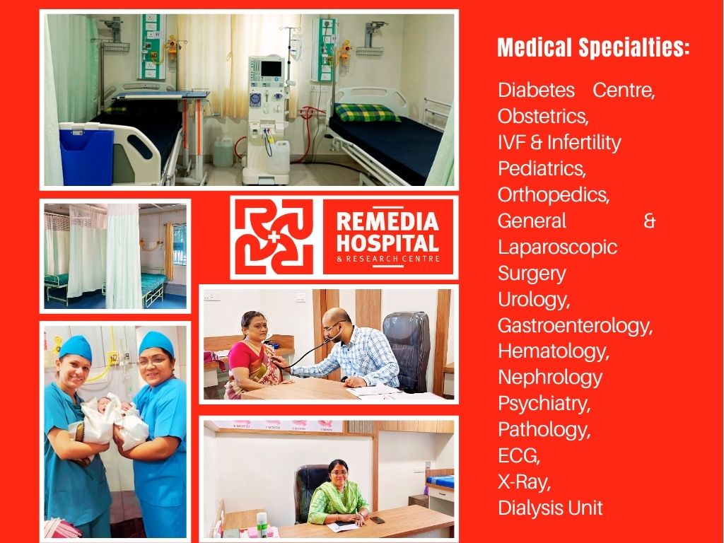 With 24×7 Emergency ICU Services, fully equipped Operation Theatres, specialized units like NICU, SICU, and Dialysis, and a dedicated IVF & Test Tube Baby Centre, Remedia Hospital is committed to providing high-quality healthcare solutions.